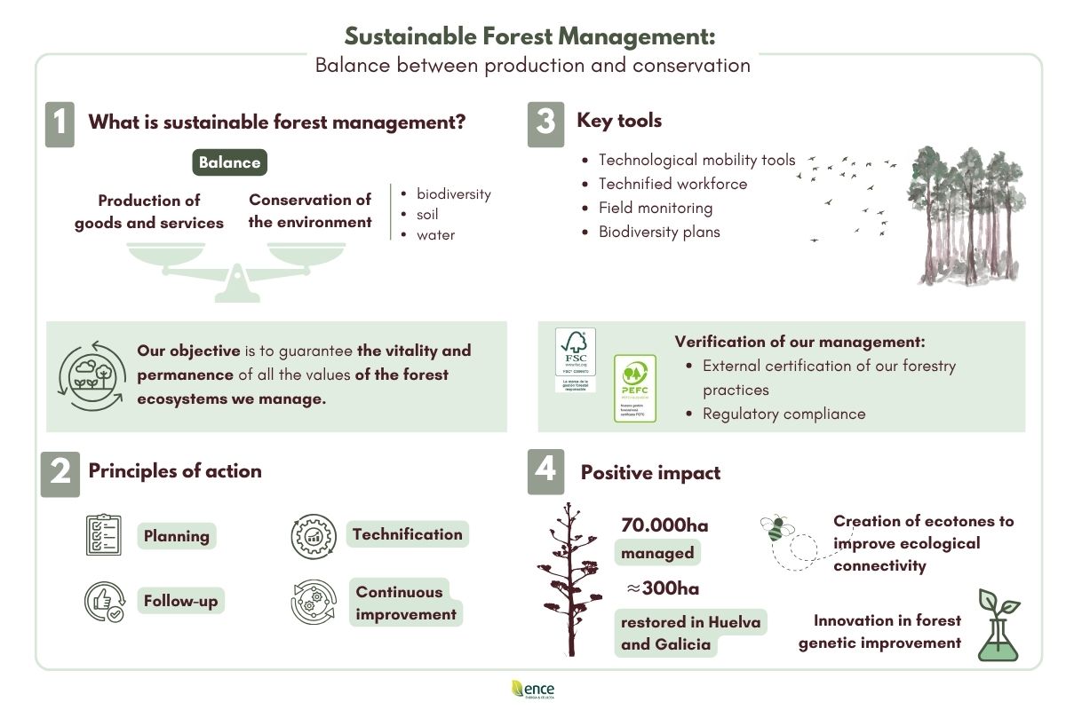 Forest sustainability is the basis of responsible forest management. It involves caring for our forests so that they continue to be sources of life, resources, and well-being, both, today and in the future. ENCE pursues this approach by seeking a balance between the production of wood and other forest products, the conservation of biodiversity, and respect for the social and cultural values that forests contribute to our communities. The traceability of forest products allows consumers to know the origin of what they buy and ensure that it comes from sustainable management. Sustainable Forest Management is also an effective tool in the fight against illegal deforestation by ensuring transparency throughout the value chain, and in the fight against climate change by promoting resilience among the masses.